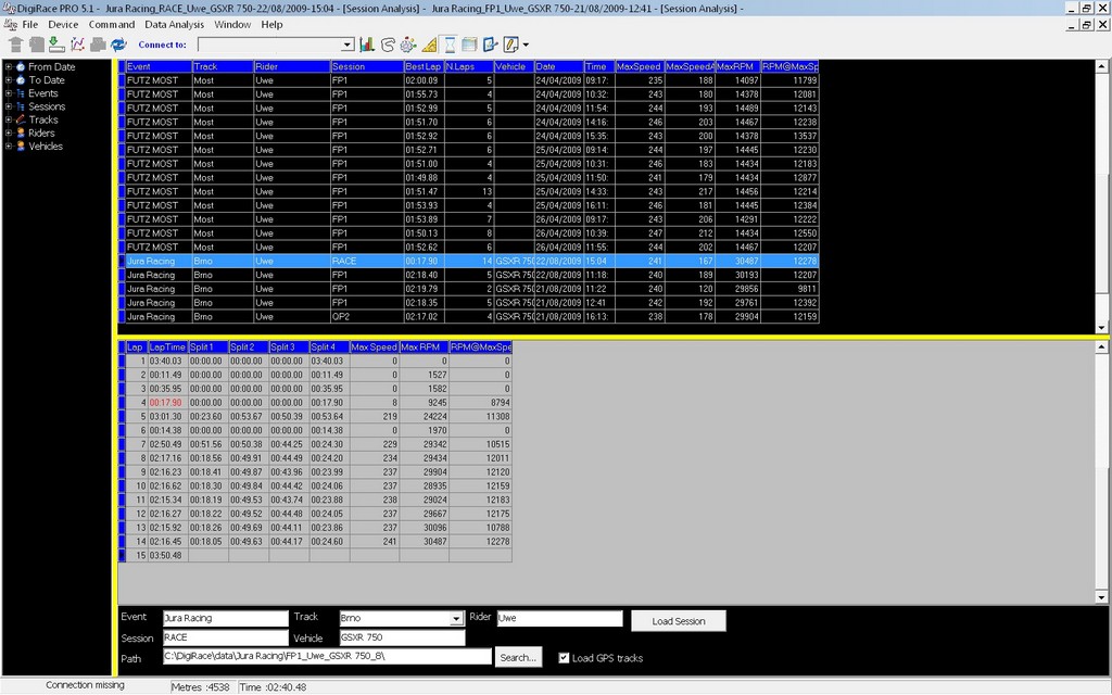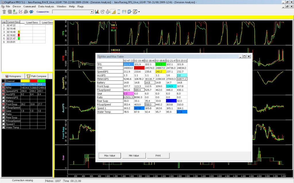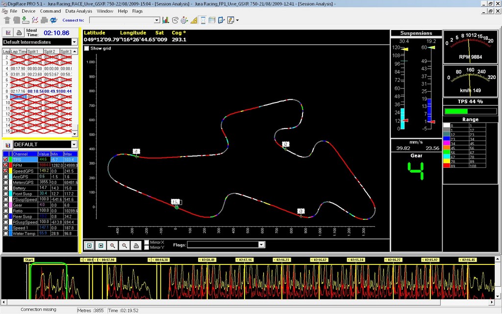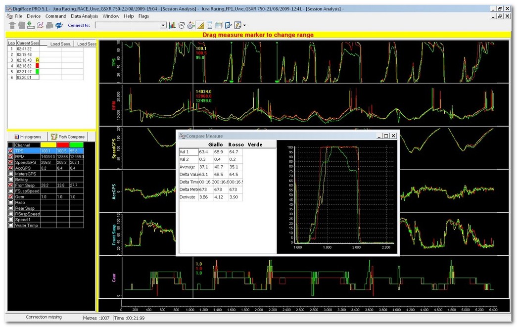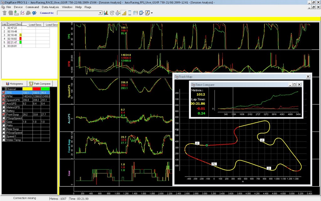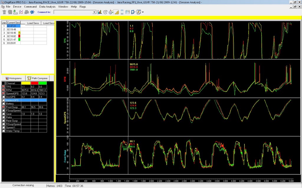 Durch Klicken des Buttons “Compare” im oberen Menü erreicht man das Vergleichsfenster. Hier können bis zu 3 Runden, auch verschiedener Sessions, übereinandergelegt und verglichen werden.