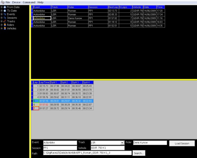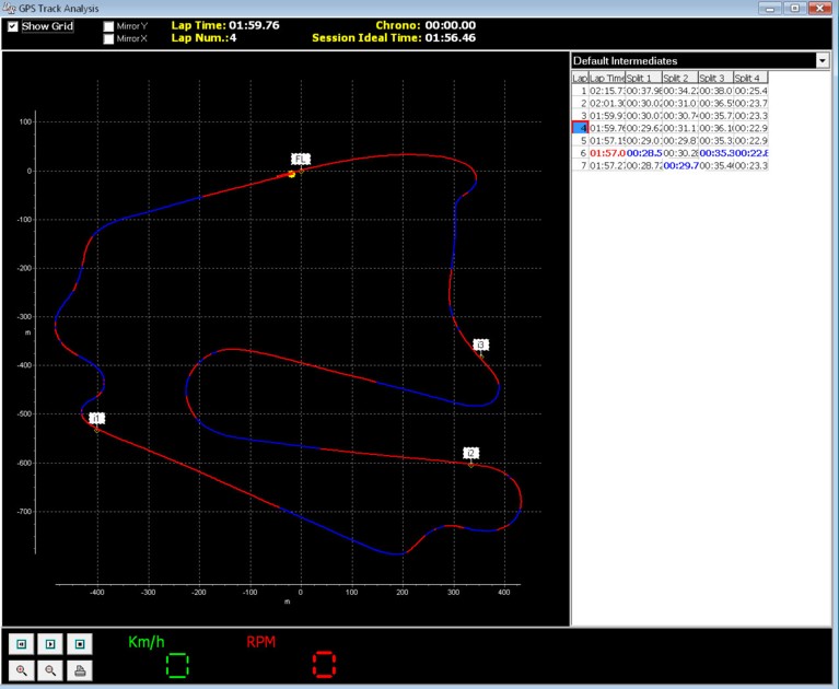 Rechts im weissen Fenster sieht man alle gefahrenen Runden dieser Session mit den einzelnen Zwischenzeiten.